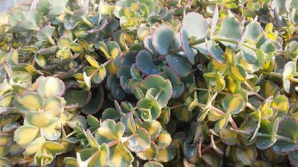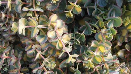 An eye catching succulent for the alpine garden. Slate green foliage has cream white centers (gold in spring). The arched branching habit makes it appear like a cute little water fountain. Pink flowers bloom on tips in summer.