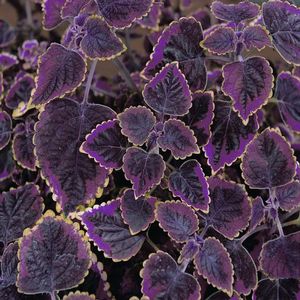 The opposite of its rose companion, this coleus features a big blast of rich purple burgundy in the center of each leaf, surrounded by bright rose with a delicate bright gold edge. Trailing habit for containers and baskets.